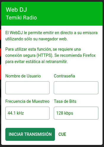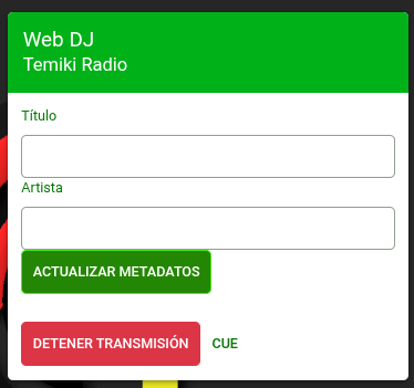 Cuando inicias transmisión Podrás Ponerle un título como el tema o nombre del programa y en nombre del artista tu pseudónimo o nombre real. Para que se vea reflejado en el reproductor tienes que dar click en ACTUALIZAR METADATOS.